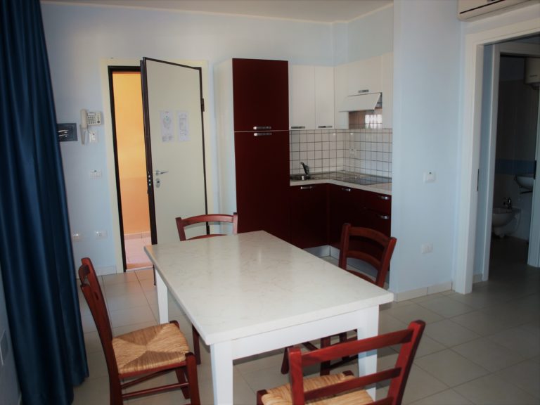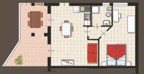 Composto da: camera matrimoniale. Zona giorno con angolo cottura e divano letto 2 posti, spazio esterno parzialmente coperto da loggia attrezzato con tavolo e sedie. Bagno con doccia.