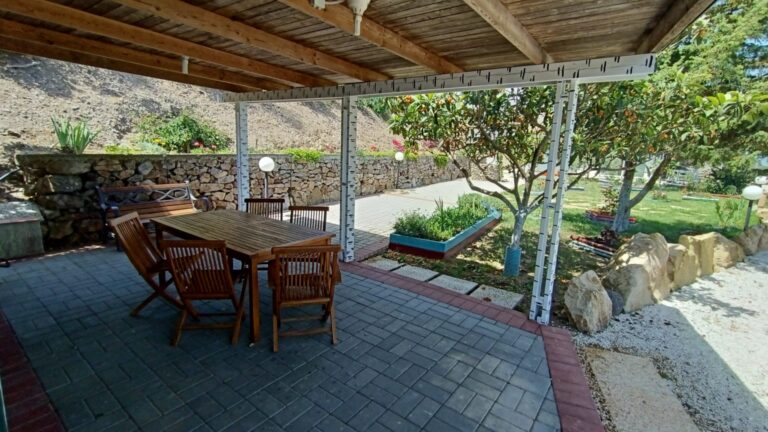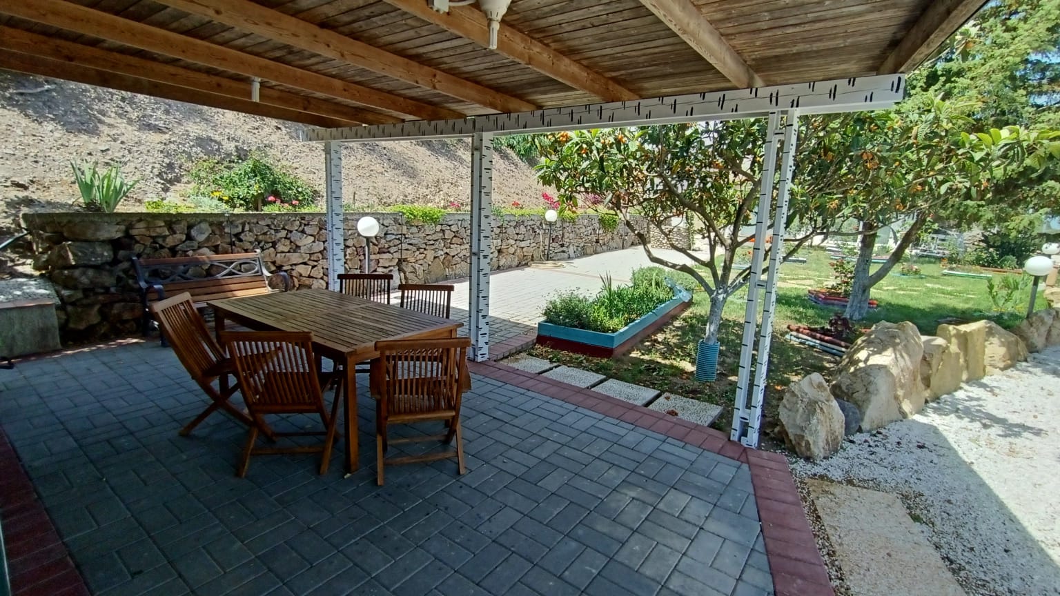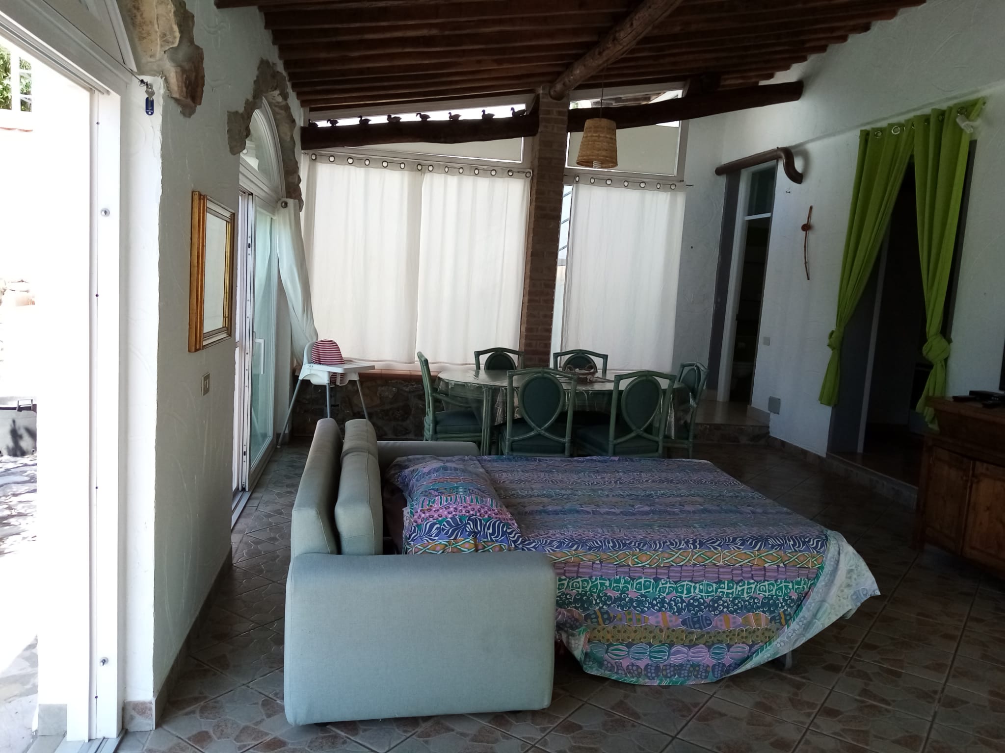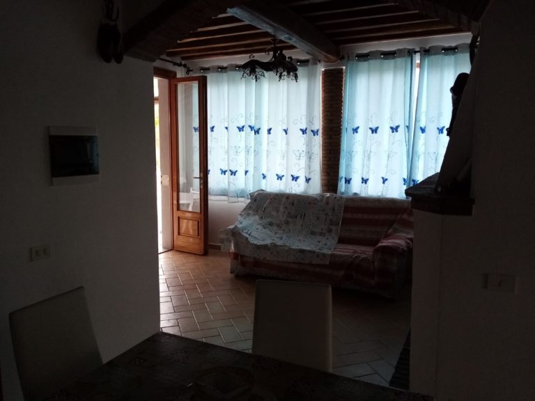 Ampio locale costituito da vetrate che rendono il salone molto luminoso, ospita un divano letto e la zona pranzo, da qui si accede al bagno, al cucinotto ed alla camera matrimoniale. All’ esterno un patio ombreggiato attrezzato per mangiare fuori