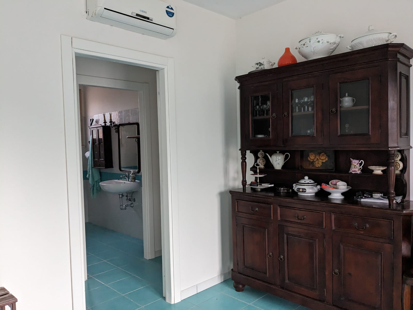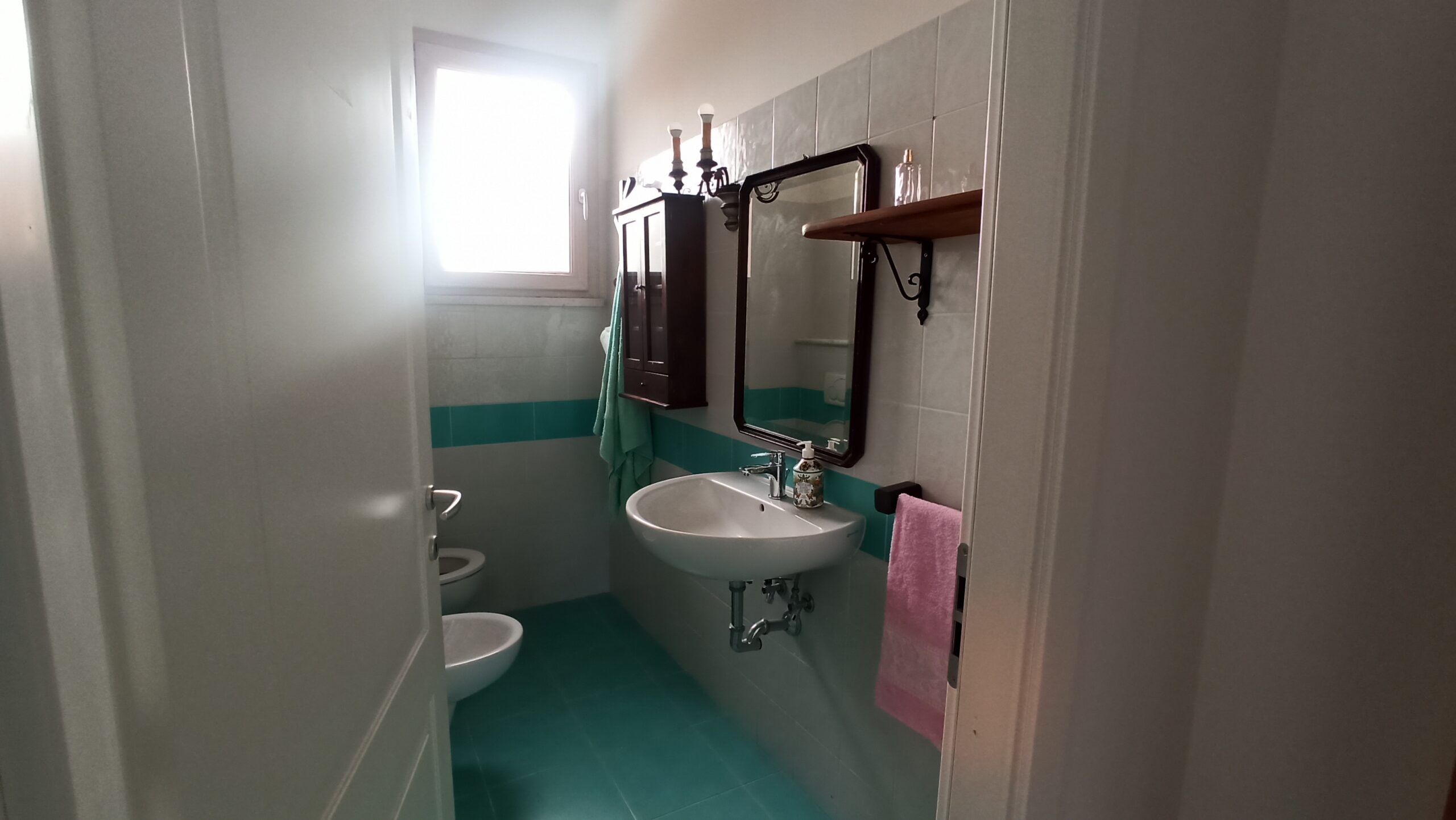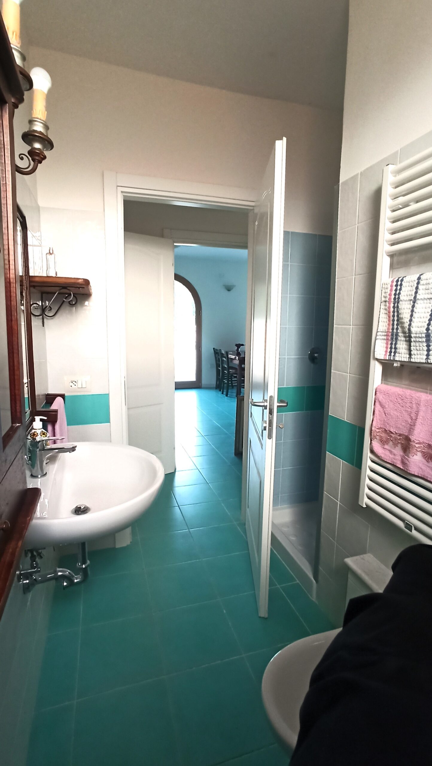 Bagno attrezzato con doccia, riscaldato con termoarredo.