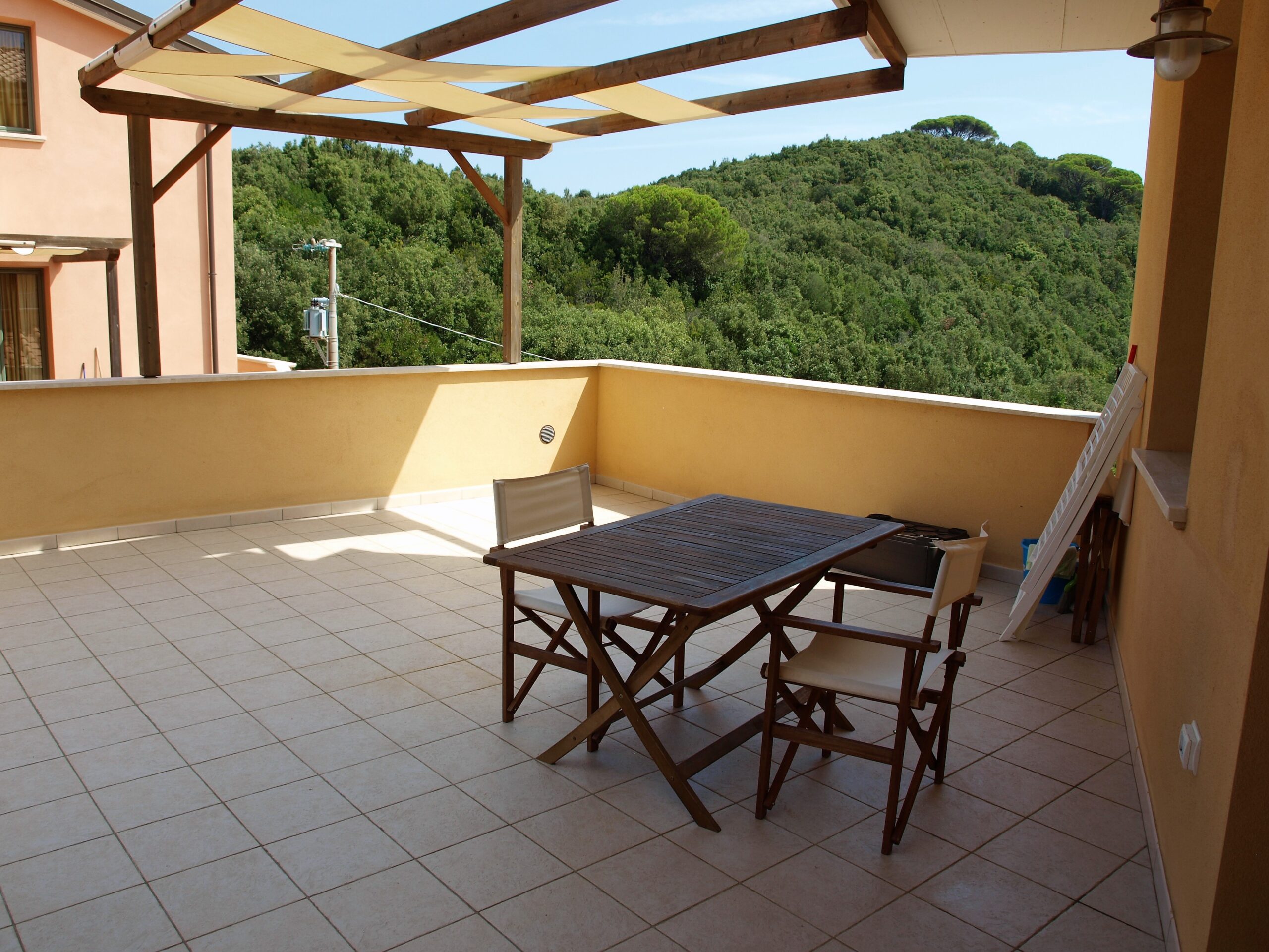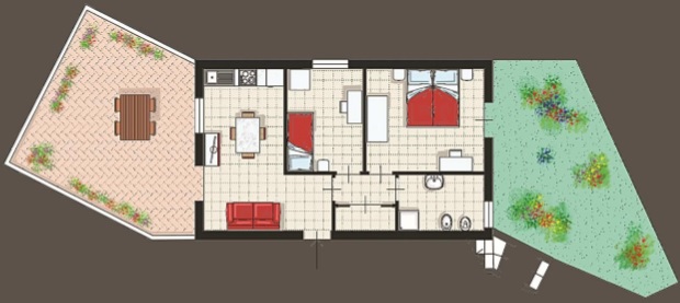 Ingresso indipendente in zona giorno con angolo cottura; l’ambiente è ampio e luminoso, è collegato con il terrazzo esterno sul fronte che da trasversalmente sia sulla piscina, che sulla vallata. Disimpegno, camera matrimoniale con accesso al giardino, cameretta, bagno finestrato con box doccia