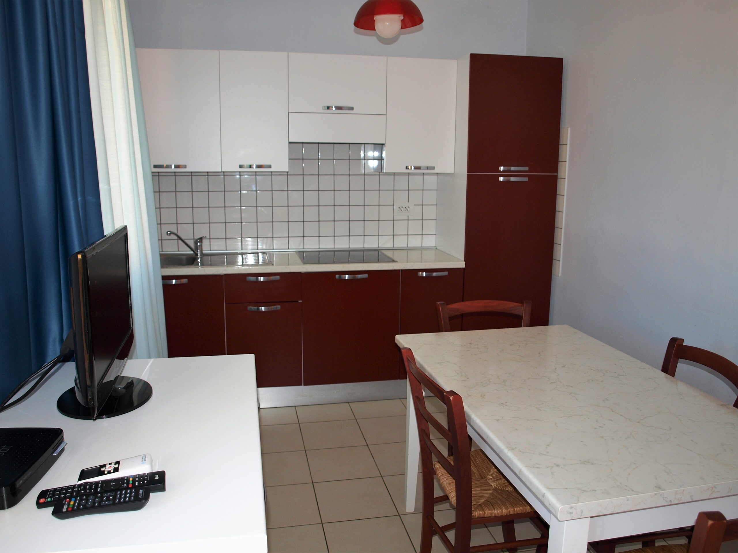 piano cottura ad induzione in vetro ceramica, frigorifero con cella freezer, divano letto 2 posti in soggiorno, climatizzatore nella zona giorno e nelle camere da letto,