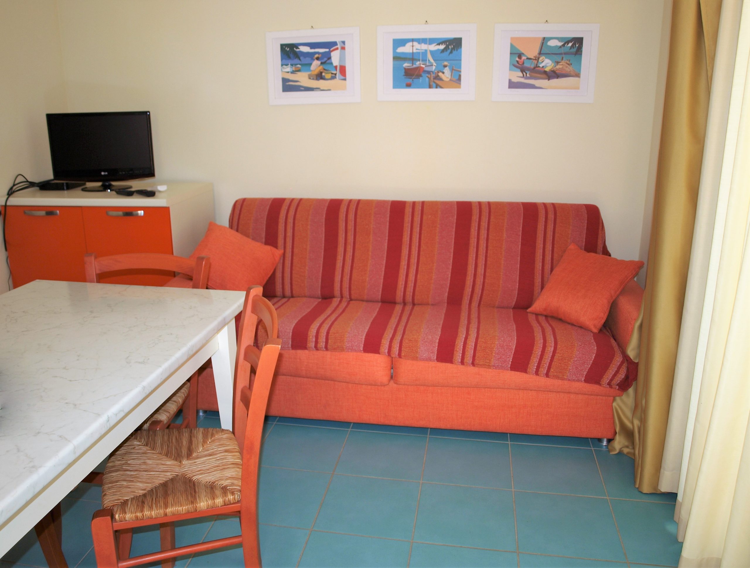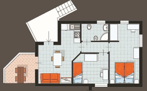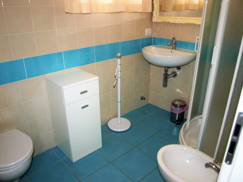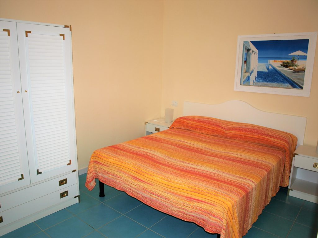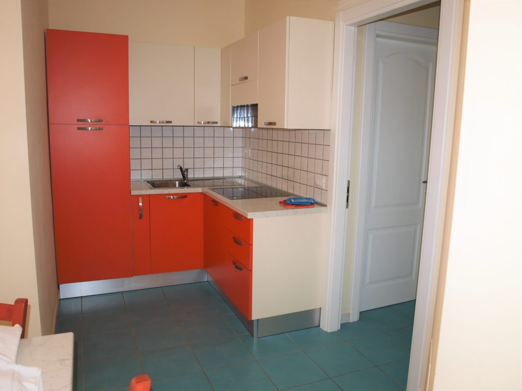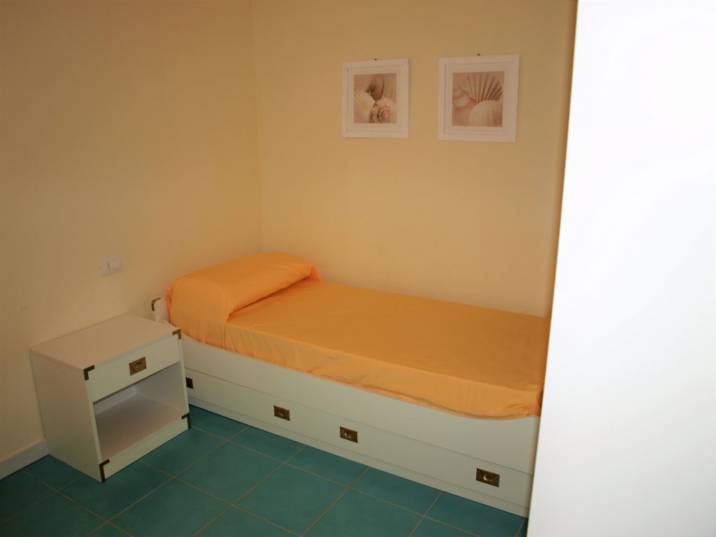 Appartamento trilocale di 55mq, internamente composto da: ingresso soggiorno con angolo cottura e divano letto, da qui si accede al terrazzo pranzabile coperto con pergolato a teli; disimpegno notte, bagno finestrato con box doccia e lavatrice, ampia camera matrimoniale con doppio armadio, cameretta singola con letto aggiunto estraibile.